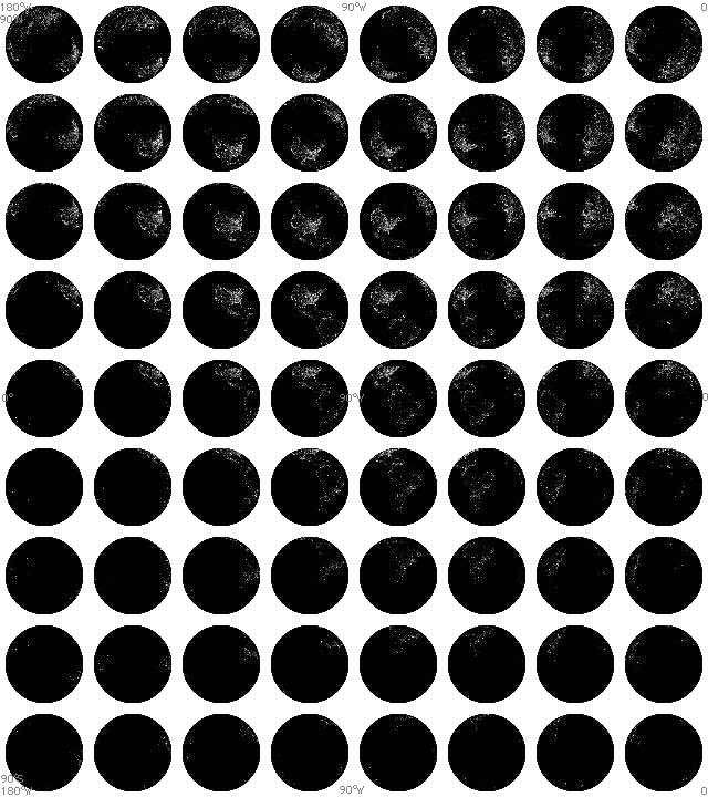 The thumbnails below are arranged by longitude, left to right from 0 degrees to 180 degrees East, in increments of 22.5 degrees rotation. Latitude is arranged top to bottom from 90 degrees North to 90 degrees South, in increments of 22.5 degrees. Click here to return to 180 degrees West longitude to 0 degrees view or scroll back up this page. View sample image.
